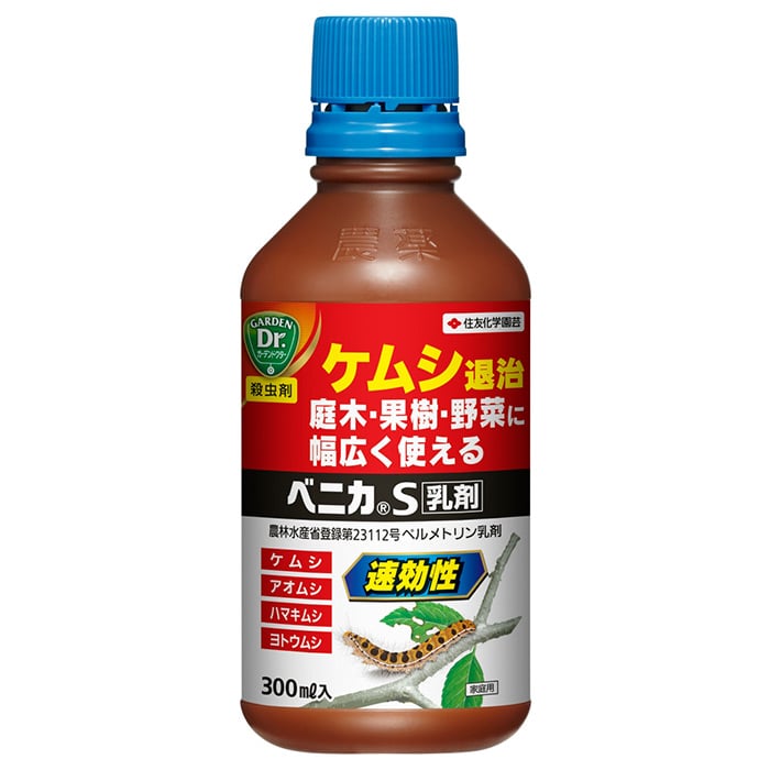 ケムシ、アオムシなどチョウ目害虫に優れた効果があり、庭木、果樹、野菜などに幅広く使えます。速効性と持続性(チャドクガ・若齢幼虫で1~2週間、散布薬)があり、害虫を効果的に退治します。