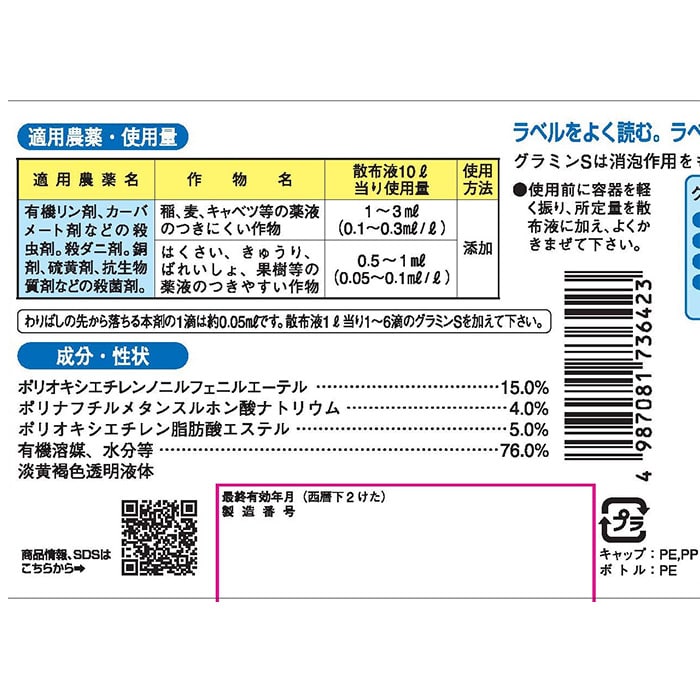 ●使用量の目安(約):散布液10L当たり0.5~3mL
