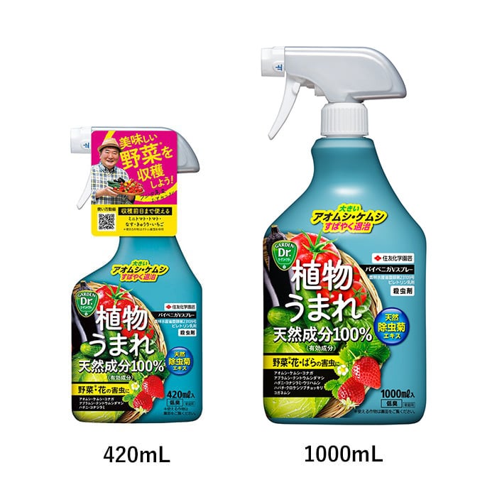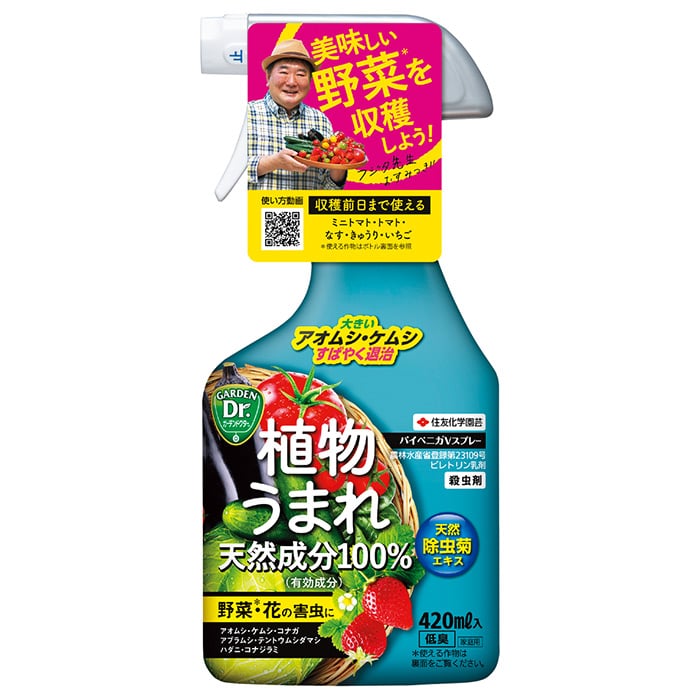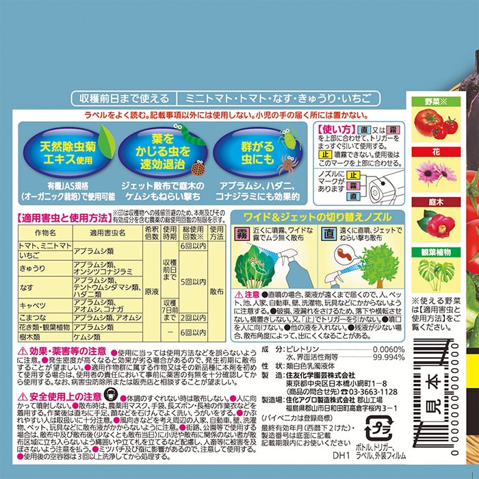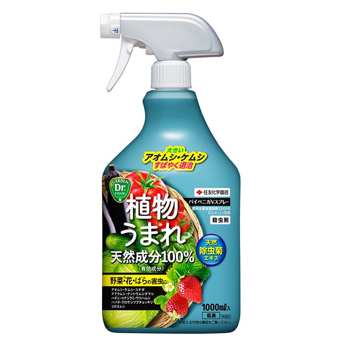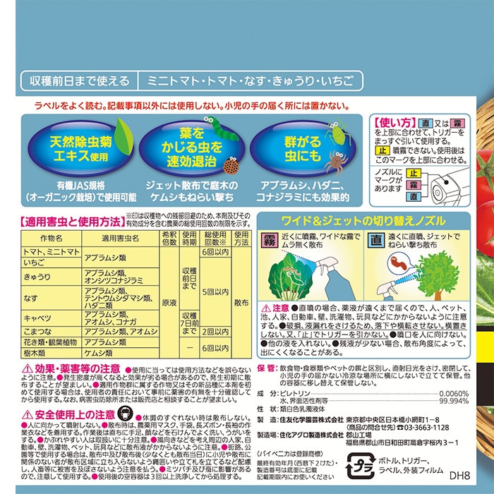 天然除虫菊エキス使用で、有機JAS規格(オーガニック栽培)でも使用可能です。葉をかじる虫を速効退治したり、ジェット散布で庭木のケムシを狙い撃ちすることもできます。アブラムシ、ハダニ、コナジラミなど群がる虫にも効果的です。