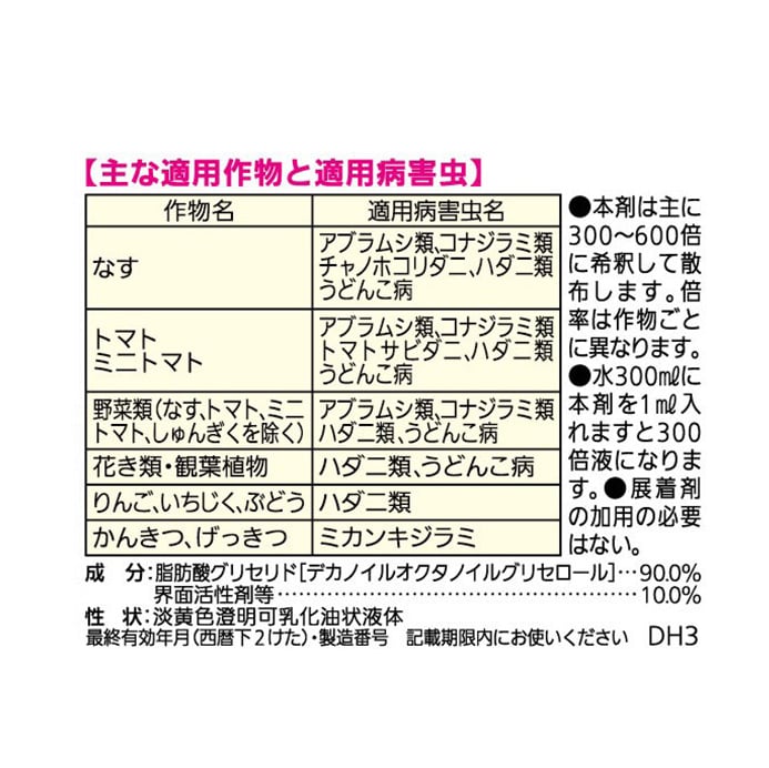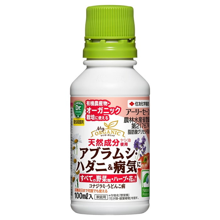 ・野菜類やハーブのハダニ、アブラムシ、コナジラミ、うどんこ病の防除に効果的です。