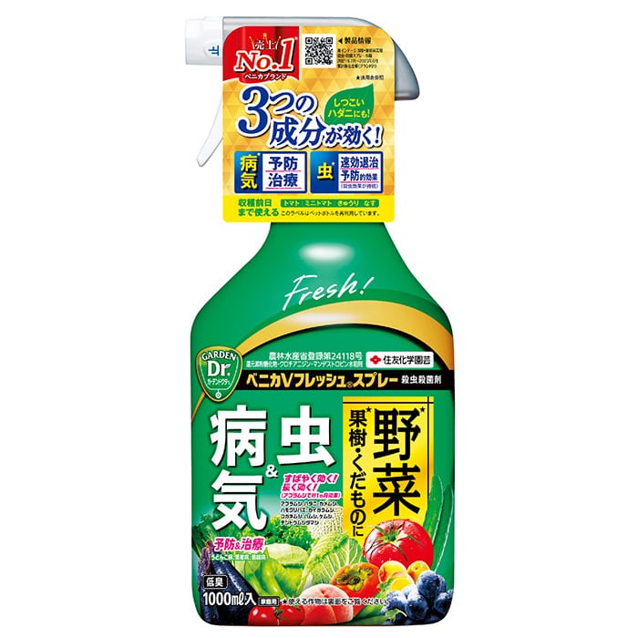 野菜、果樹、花、庭木など幅広い植物に使える殺虫殺菌スプレー。害虫にすばやく、長く(アブラムシに1カ月)効き、薬剤抵抗性害虫にも効く。病原菌の感染を防ぐ(予防)&感染後の症状拡大を止める(治療)。殺虫・殺菌成分が植物に浸透移行するので、雨が降っても効果が続く。