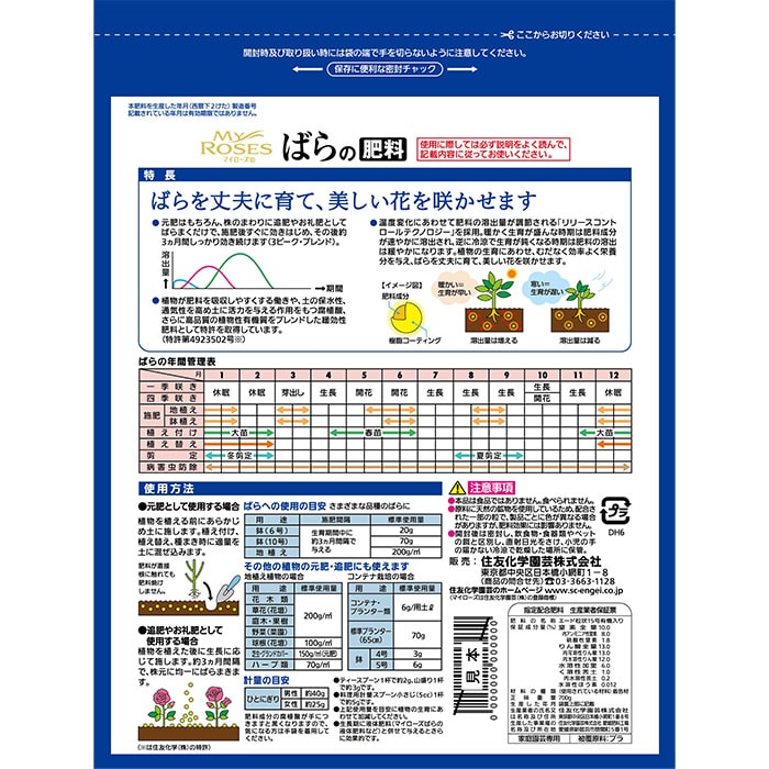 温度変化に合わせて肥料の溶出量が調節される「リリースコントロールテクノロジー」を採用。暖かく生育が盛んな時期は肥料成分が速やかに溶出され、逆に冷涼で生育が鈍くなる時期は肥料の溶出は緩やかになります。においが少なく、元肥としても追肥としても使えます。効果は約3カ月間効き続けます。