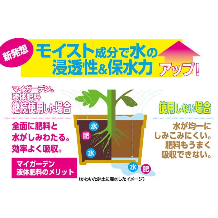 乾きやすい鉢土でも水分とともに肥料成分がすみずみまでしみわたるようになり、効率よく肥料が吸収されます。