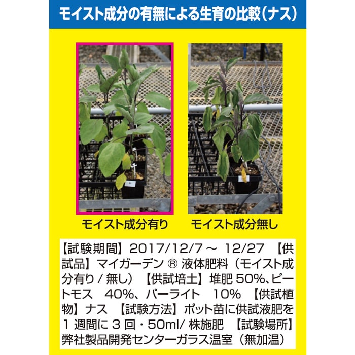 ※1:モイスト成分有無による比較 ※2:液体肥料の浸透性を高め、保水性を向上させる