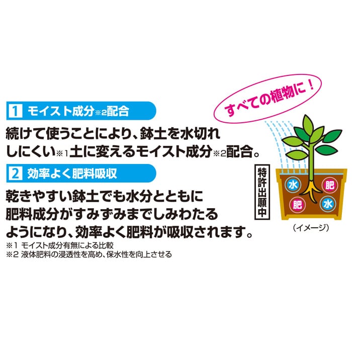 続けて使うことにより、鉢土を水切れしにくい(※1)土に変えるモイスト成分(※2)配合
