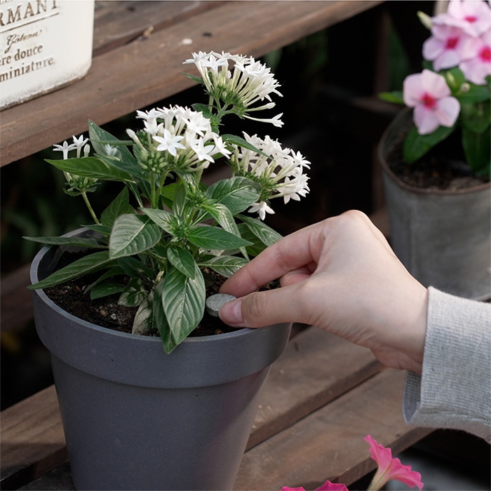 株元に置くだけで、水やりのたびに少しずつ肥料成分が溶けだしてゆっくり効果を発揮。約2~3カ月効果が持続します。