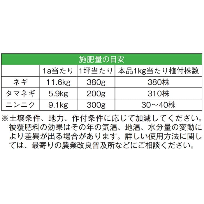 特に長ネギに好適で、ゆっくりと徐々に肥料が効くように設計されているため、一度に大量を施すことによる生育の不安定さを防ぎます。