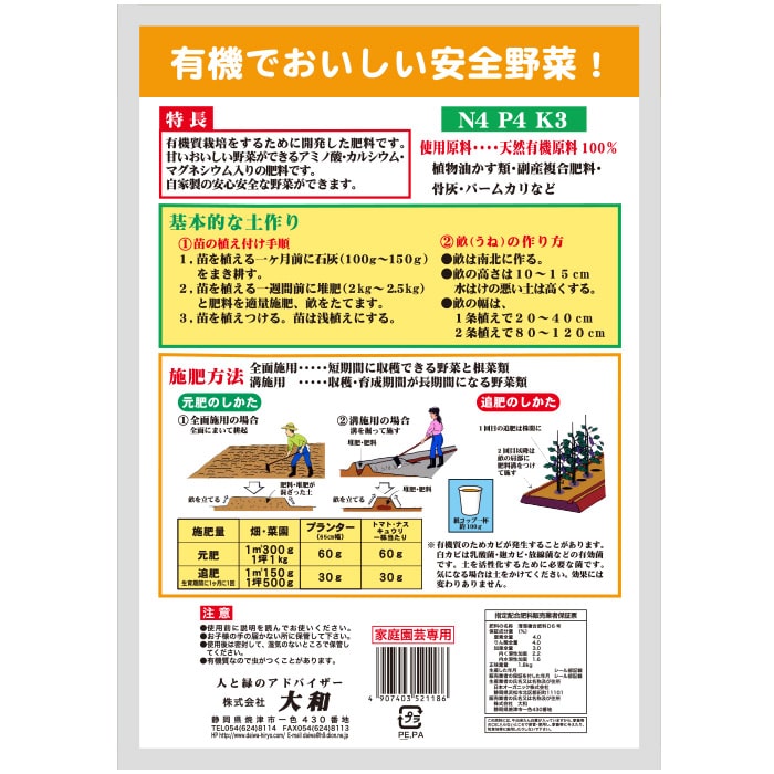 有機由来原料100%の野菜専用に開発した肥料です。有機100だから辛み・苦みのないおいしい野菜が育ちます。