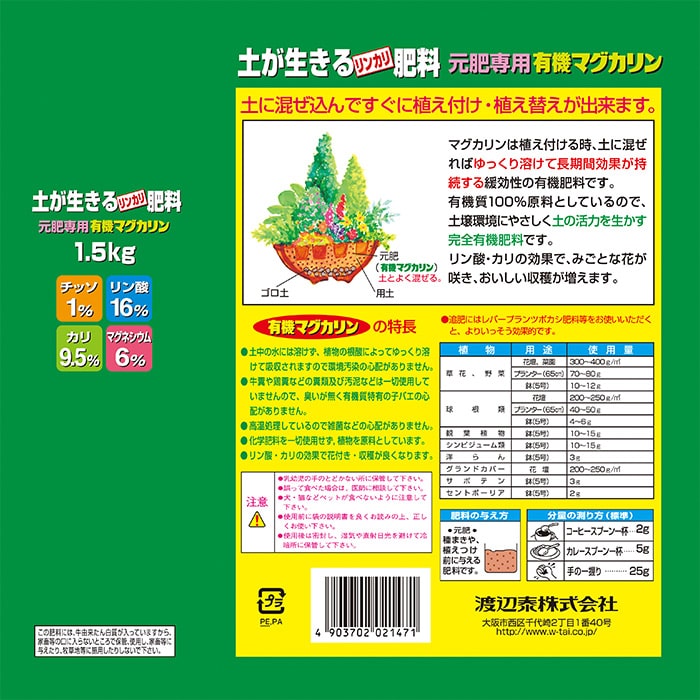 植え付け時に土に混ぜれば、ゆっくりと溶けて長期間効果が持続する緩効性の完全有機肥料です。安全で土壌環境にも優しく、土の活力を生かし、植物の成長初期には根の生育を促す効果があります。また、含まれているリン酸・カリ分は約200日間効果が持続します。