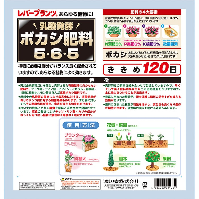肥効期間約120日! 植物に必要なブドウ糖、アミノ酸、ビタミン、ミネラルなどをバランスよく配合してあるので、あらゆる植物によく効きます。肥料に含まれる乳酸菌の働きにより、植物の生育を助けます。