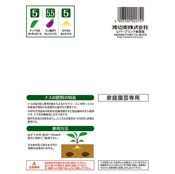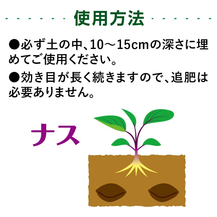 肥効期間約120日! 一般的なナスの他、長ナス・丸ナスなどいろいろなナスにおすすめです