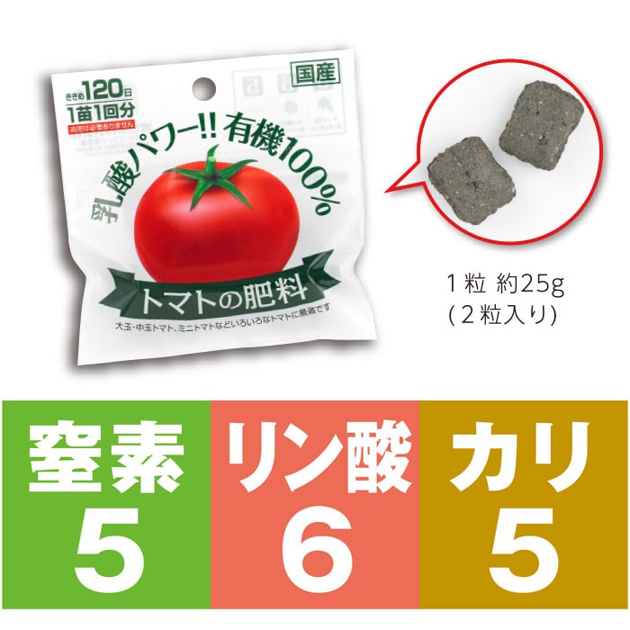 【トマト】トマトの苗1株に肥料2粒を施すだけでシーズン中(約120日間)ゆっくりと栄養素が吸収されるため、追肥の必要がありません。100%天然由来の材料を乳酸発酵させたボカシ肥料です。