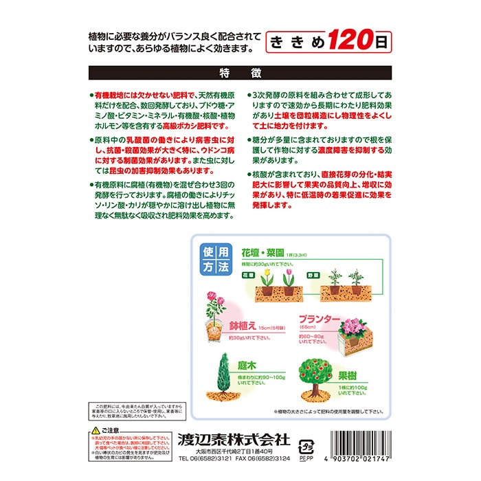 肥効期間約120日! 植物に必要なブドウ糖、アミノ酸、ビタミン、ミネラルなどをバランスよく配合してあるので、あらゆる植物によく効きます。肥料に含まれる乳酸菌の働きにより、植物の生育を助けます。