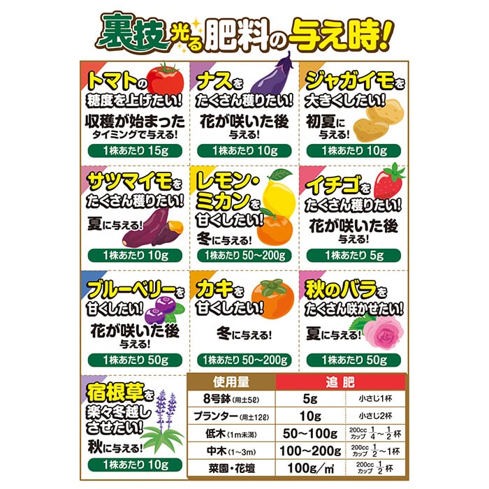 さまざまな果菜・根菜・草花・果樹をより充実させるための肥料です。