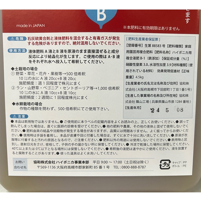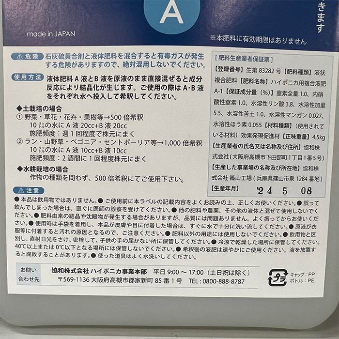 植物の生育に必要な成分を取りそろえた、2液構成の肥料
