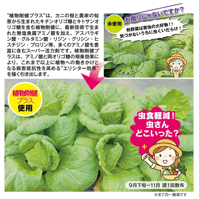 「植物剛健プラス」は、カニの殻と農家の知恵から生まれたキチンオリゴ糖とキトサンオリゴ糖を含む「植物剛健」に、最新技術で生まれた無塩魚醤アミノ酸を加え、アスパラギン酸・グルタミン酸・リジン・グリシン・ヒスチジン・プロリン等、多くのアミノ酸を豊富に含むスーパー活力剤です。「植物剛健プラス」はアミノ酸と両オリゴ糖の相乗効果により、これまで以上に植物への働きかけとなる病害抵抗性を高める“エリシター効果”を強く引き出します。