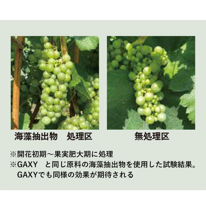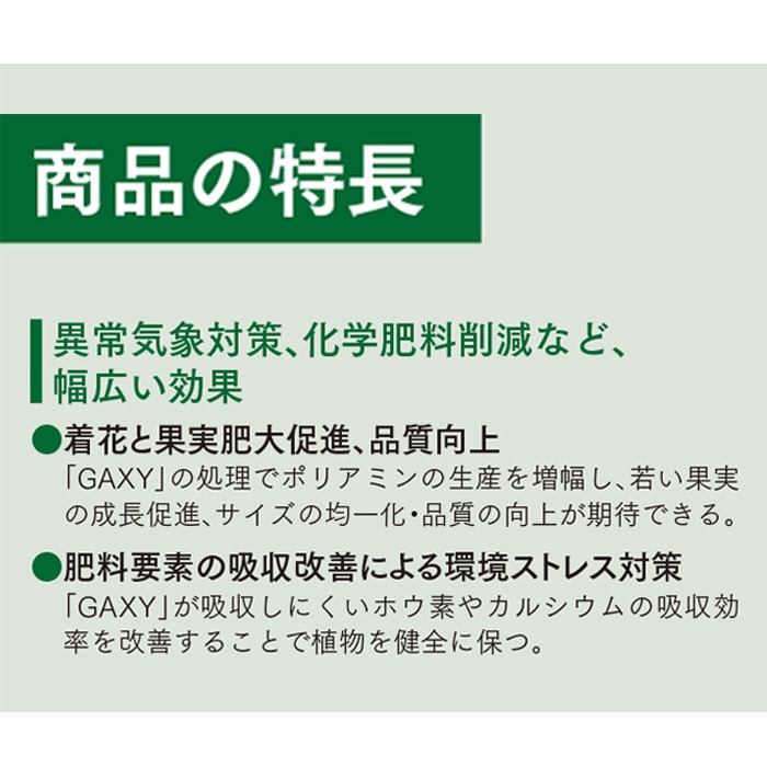 「GAXY(ギャクシー)」はフランスのブルターニュ地方に自生する海藻「アスコフィラム・ノドサム」を原料に抽出・調整した機能性バイオスティミュラント(BS)剤です。海藻成分由来ながら、低粘度で肥料/農薬との親和性が高く作業性に優れます。花、野菜だけでなく果樹や水稲など幅広い作物に使用できます。
