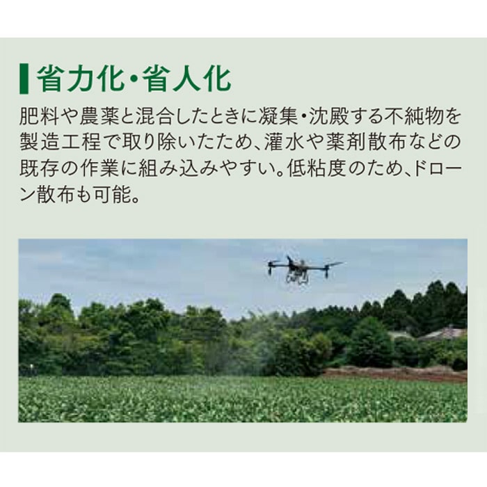 肥料や農薬と混合したときに凝集・沈殿する不純物を製造工程で取り除いたため、かん水や薬剤散布などの既存の作業に取り込みやすくできています。低粘度のため、ドローン散布も可能です。