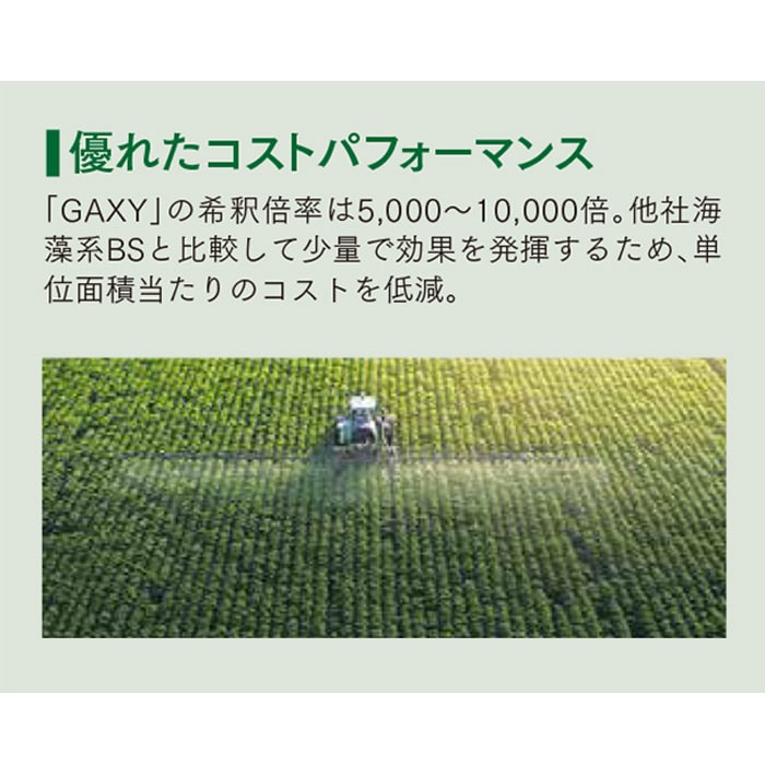 「GAXY」の希釈倍率は5000~10000倍です。他社海藻系BSと比較して少量で効果を発揮するため、単位面積当たりのコストを低減します。