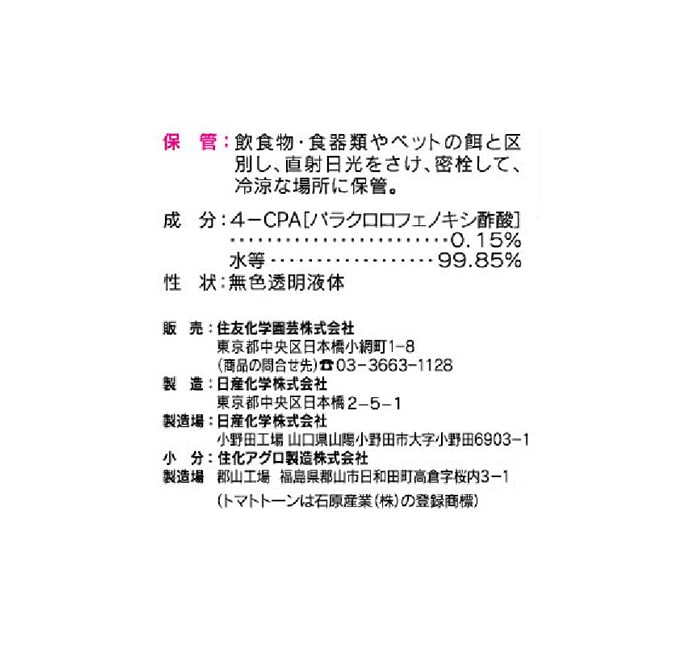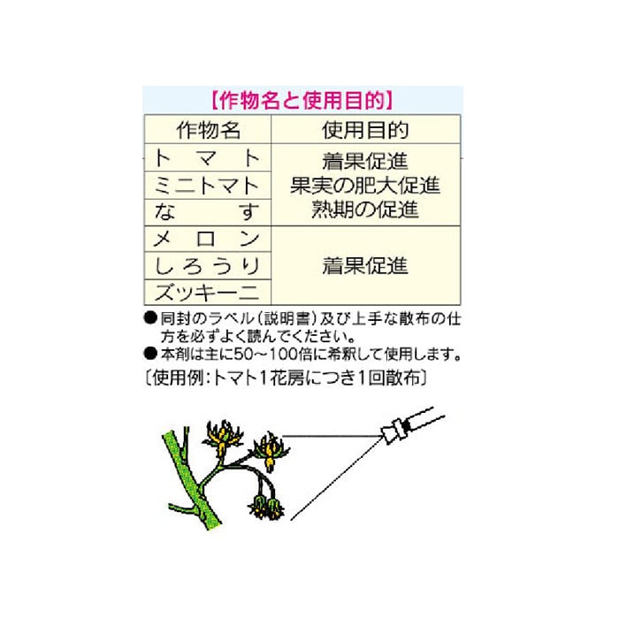 ・トマトやナスの花に散布することで、実の付きをよくする植物成長調整剤です。