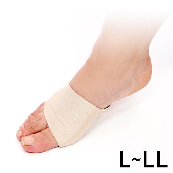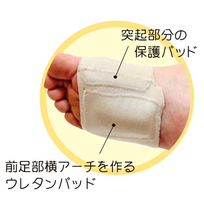 通気性のある伸縮性のよい素材を使用し、母趾球横の突出部分を薄手の立体型パッドで保護、足裏のウレタンパッドが前足部の横アーチを作り、そして心地よいサポート力で足を守ります。靴への影響を少なくするために甲の部分は薄手の伸縮素材を使用しています。