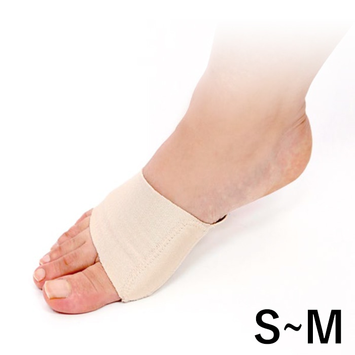 通気性のある伸縮性のよい素材を使用し、母趾球横の突出部分を薄手の立体型パッドで保護、足裏のウレタンパッドが前足部の横アーチを作り、そして心地よいサポート力で足を守ります。靴への影響を少なくするために甲の部分は薄手の伸縮素材を使用しています。