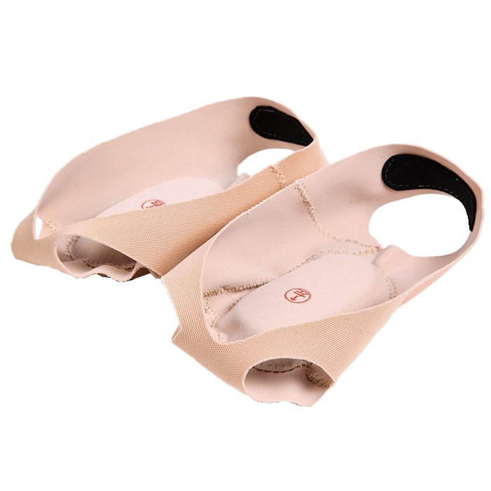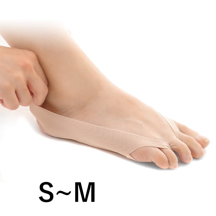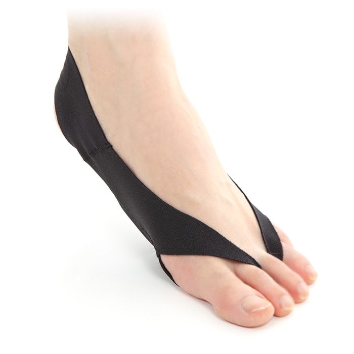 足裏の3点のアーチを支え、衝撃吸収とバネの能力を存分に発揮できるようサポートし、足にかかる負担と疲労を軽減します。足の人さし指と中指、中指と薬指の間を通して、踵に引っ掛けるだけです。これらの指を通すことで、指が使いやすくなります。甲の部分が開いているので装着したままパンプスなども履けます。