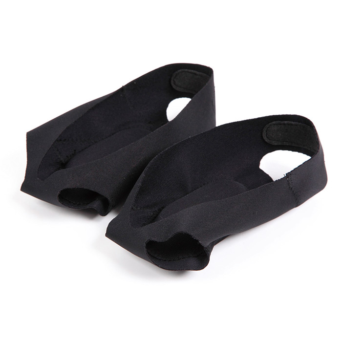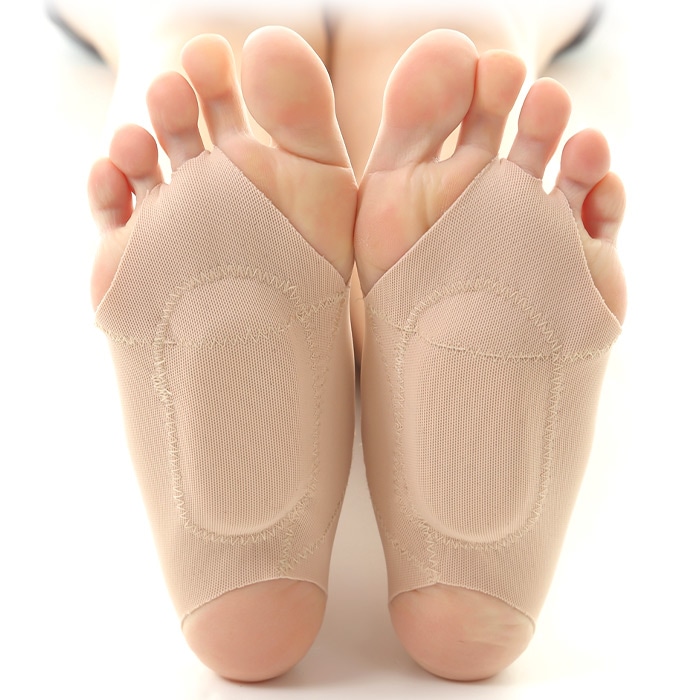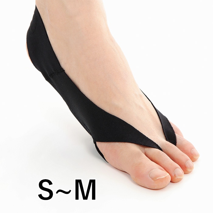 足裏の3点のアーチを支え、衝撃吸収とバネの能力を存分に発揮できるようサポートし、足にかかる負担と疲労を軽減します。足の人さし指と中指、中指と薬指の間を通して、踵に引っ掛けるだけです。これらの指を通すことで、指が使いやすくなります。甲の部分が開いているので装着したままパンプスなども履けます。