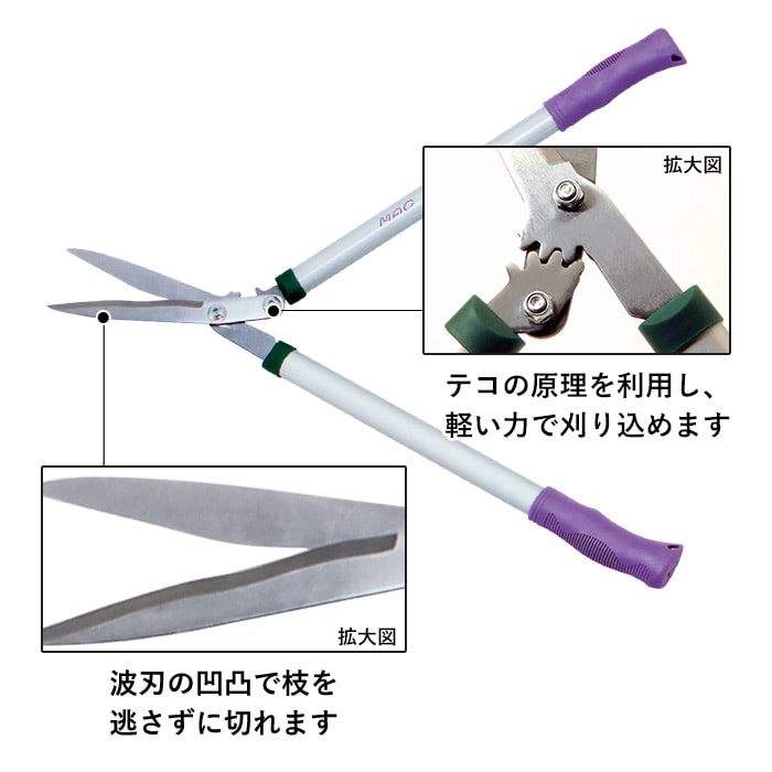 軽い力で新芽の刈り込みから直径約1.5cmの枝まで切れ、伸び過ぎた枝や生け垣の刈り込みも短時間で疲れずラクに切れます。
