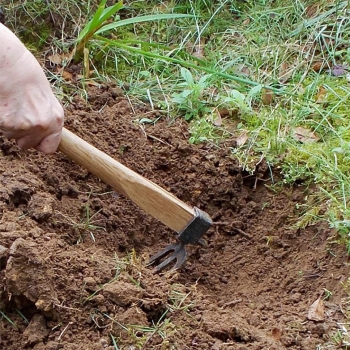 三本刃なので宿根草や球根の掘り起こしや、木の根を掘り取るのにとても便利です。振りかぶれない場所や手軽に土を耕したいときにも好適です。