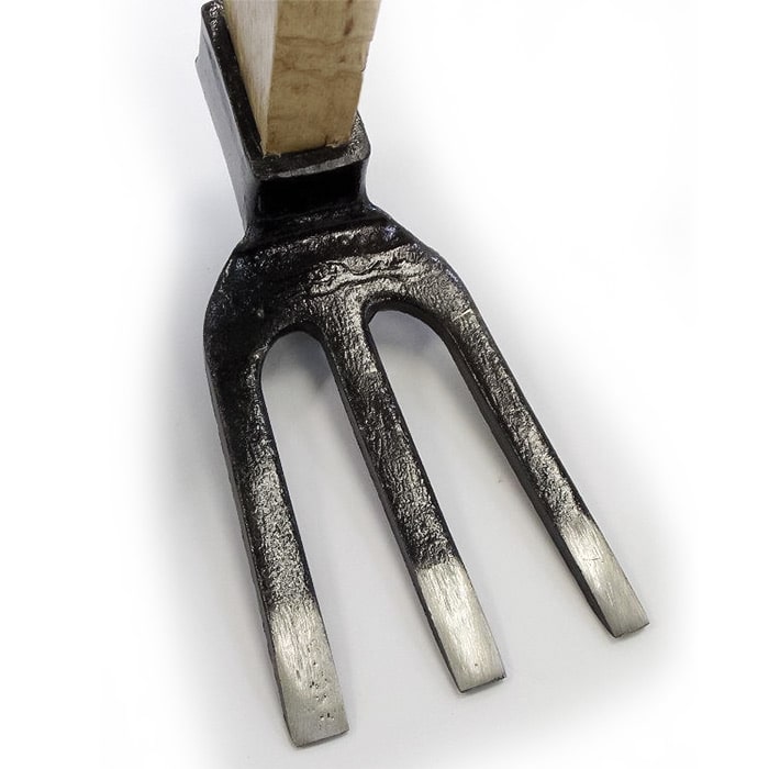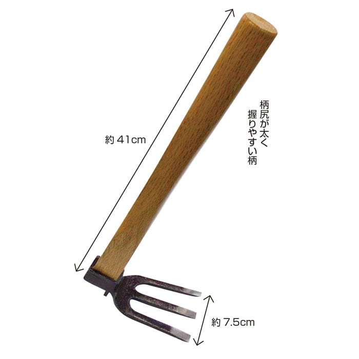 鍛造三本刃に長さ約41cmの国産天然カシの柄、頑丈でありながら約480gの重さしかなく、片手持ちに向くクワです。花壇や菜園の硬く重い土を、起こす・砕くなどに向いています。