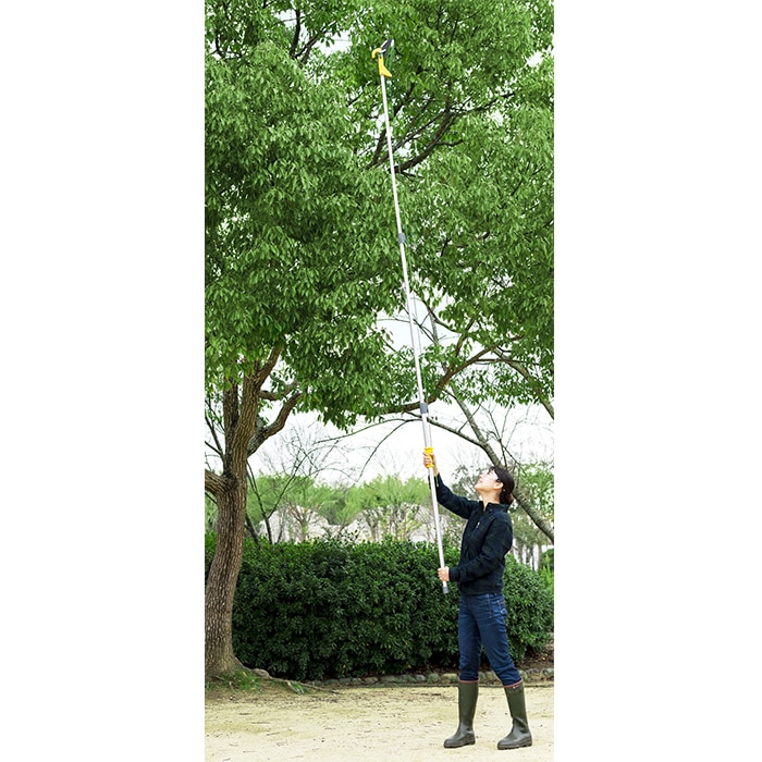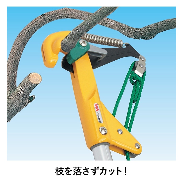 25mm径の枝までつかめるキャッチ機能付き。ロープをスライドグリップに固定して下げるだけで軽く切断できます。
