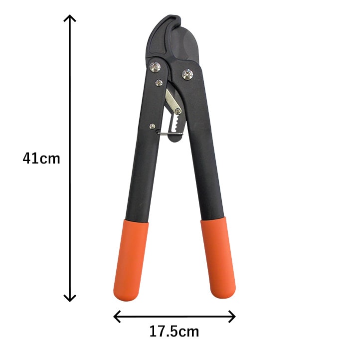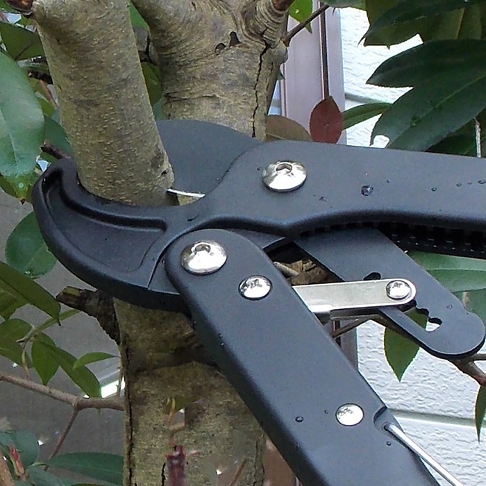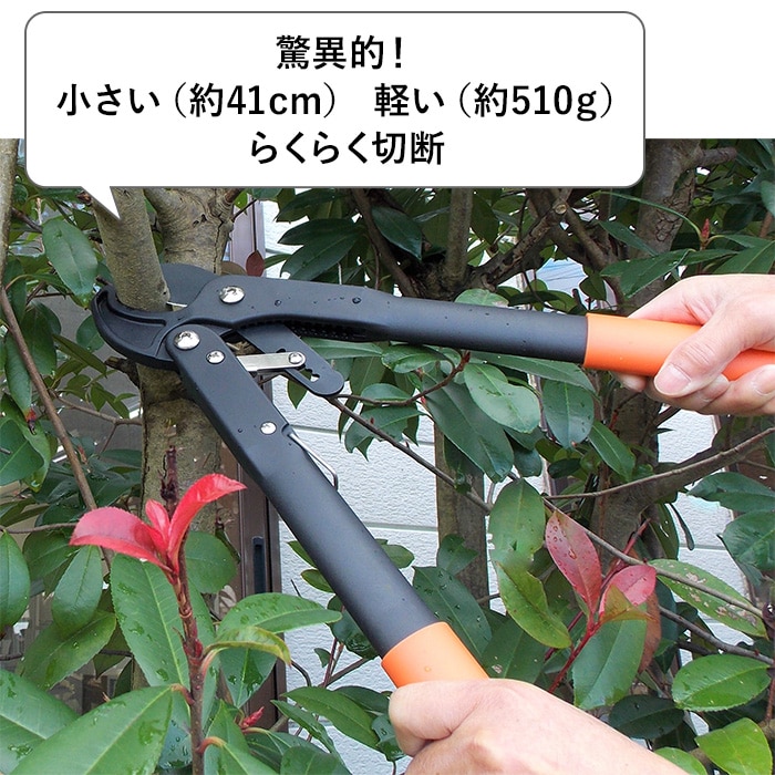 剪定バサミでは切れない枝も、「パワーラチェット太枝切鋏」なら軽い力で切れます。刃はアンビル方式(押し切り)で枝が滑らず切りやすく、切り口もきれいに切断します。普通の太枝切りバサミに比べて、大きさ、重さは約半分ですから、女性にも十分使いこなせます。