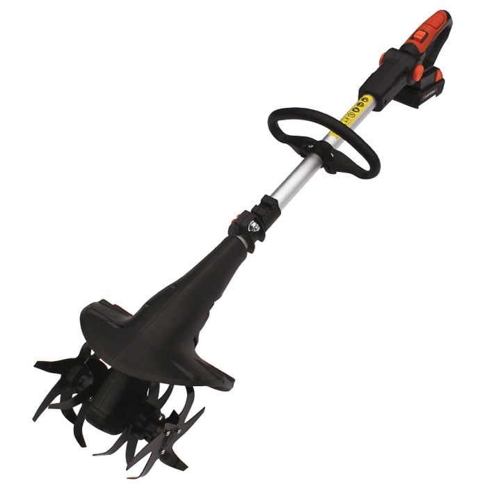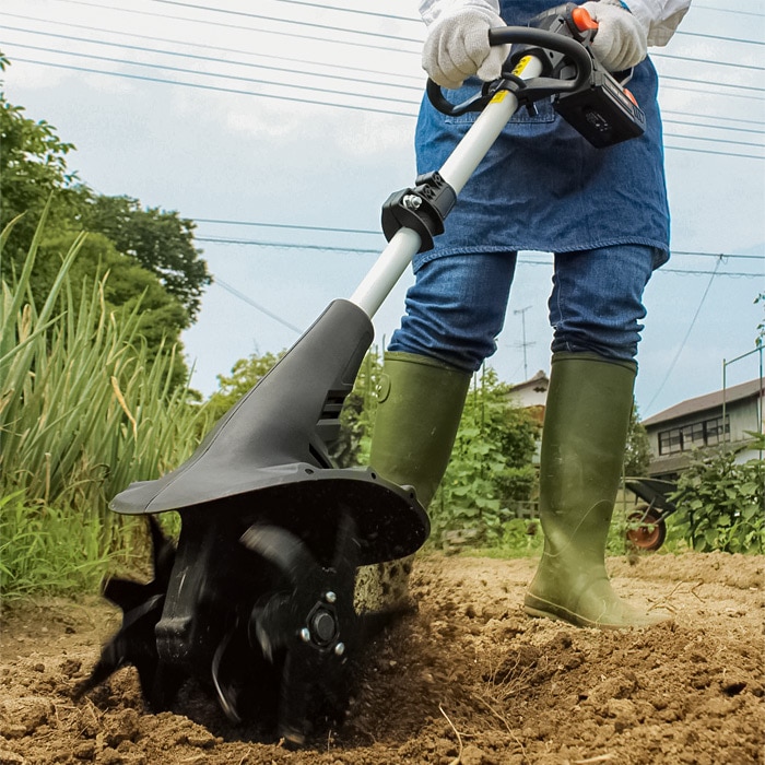 軽くてコンパクトなのにパワー十分な24V仕様なので、幅20cm、深さ8cmの土壌を素早く一気に耕せます。