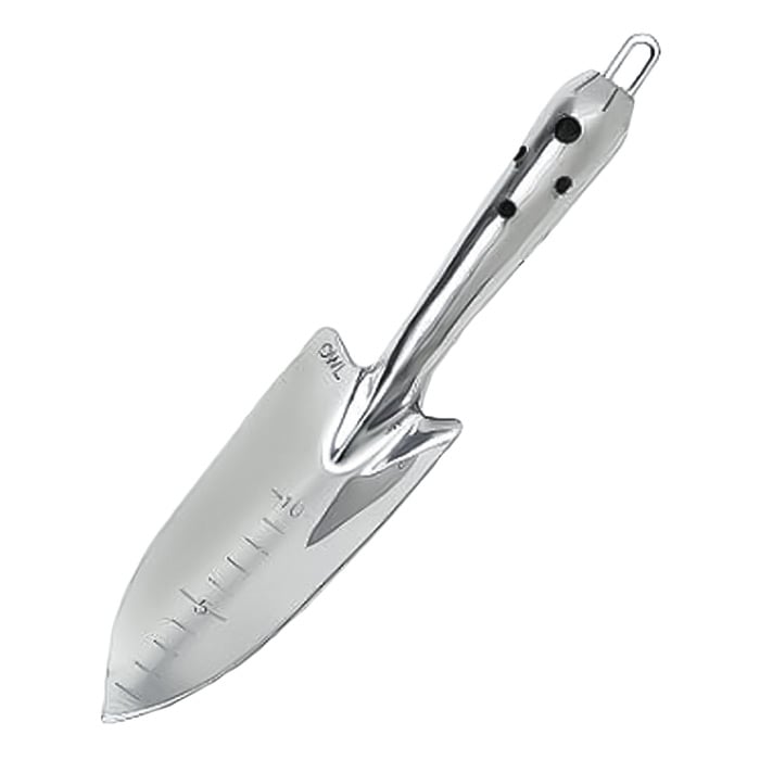 オールステンレスで土離れがよく、球根の植え付け深さが解る目盛り付き。握り部の裏面に補強板を入れているので丈夫です。収納に便利なつり金具付きです。