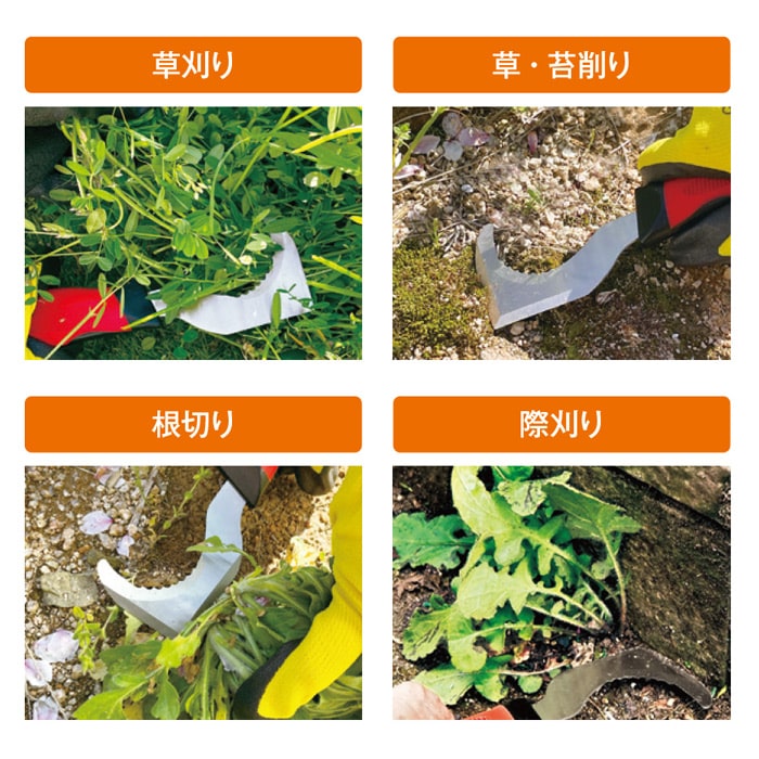 このコンパクトで機能性豊かな道具は、株間の除草など、普通のカマでは作業しづらい場所を見事にきれいにしてくれます。