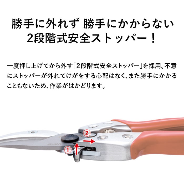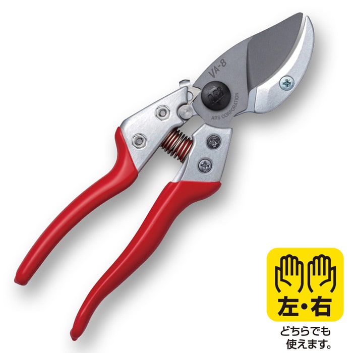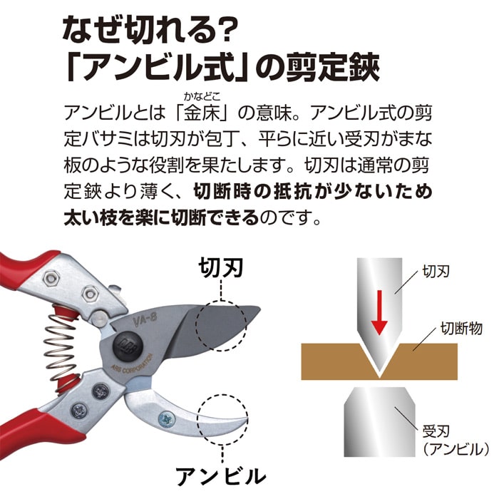 - 【アンビル式剪定鋏 VA-8Z】■サイズ(約):全長:約205mm、刃長:約47mm ■重量(約):約235g ■材質:刃部/高炭素刃物鋼、アンビル/亜鉛ダイカスト ■切断目安:生木直径25mm以下 ■表面処理方法:切刃/フッ素樹脂加工、刃・受刃/ハードクローム仕上げ