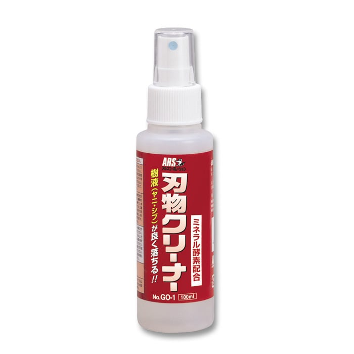 【刃物クリーナー GO-1】■内容量:100mL ■成分:アルカリ剤、泡調整剤、安定化剤、金属封鎖剤、香料、酵素、界面活性剤(2%ポリオキシエチレンアルキルエーテル) ■液性:アルカリ剤 ■品名:合成洗剤
