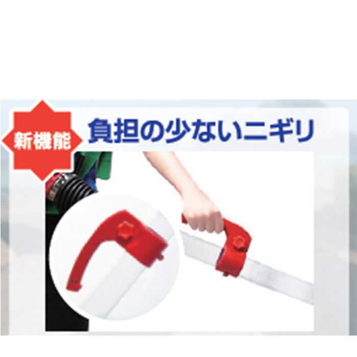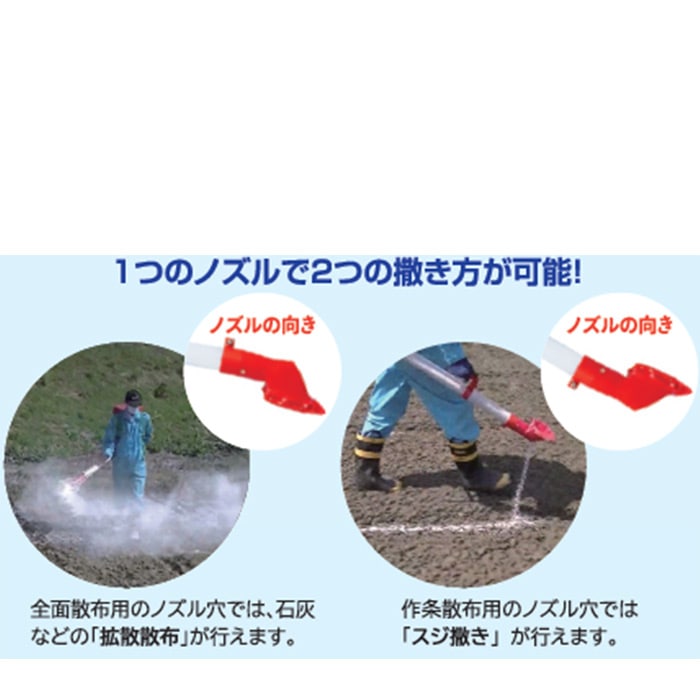 粒状・粉状の肥料散布が効率よく行えます。アーチ状の握りのため、手首を下に向けても負担がかかりにくい設計です。ノズルの向きを変えるだけで拡散散布⇔作条散布(すじまき)ができます。透明パイプのため、散布量が目視で確認できて便利です。流量調節板付きです。腰当てマットで腰への負担を和らげます。