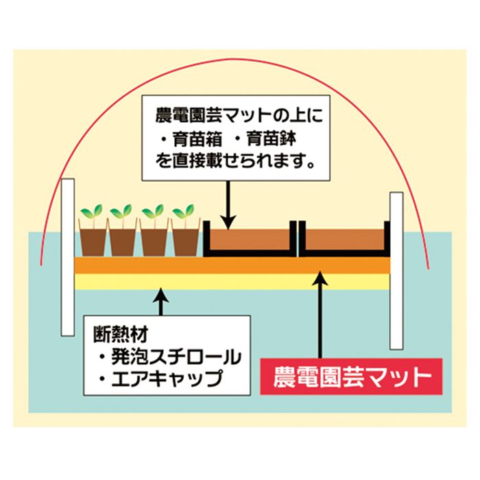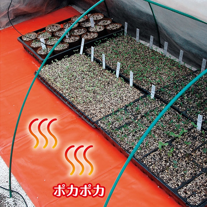 【農電園芸マット】手軽で安全かつ経済的に使えるマット状の電気ヒーターです。マットを広げてサーモと接続し通電すれば、育苗ポットや苗床を自動で温度管理できます。