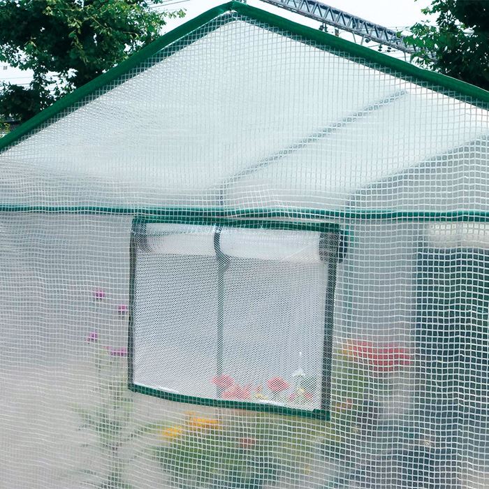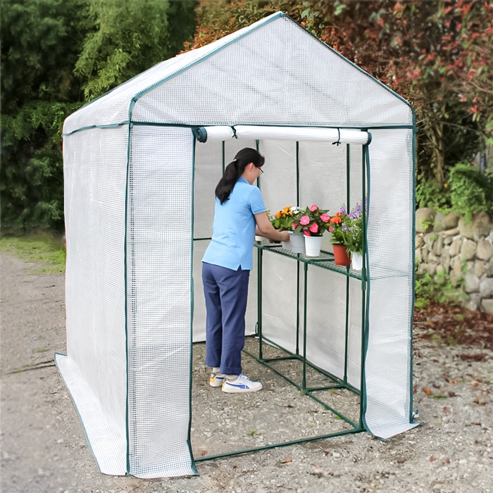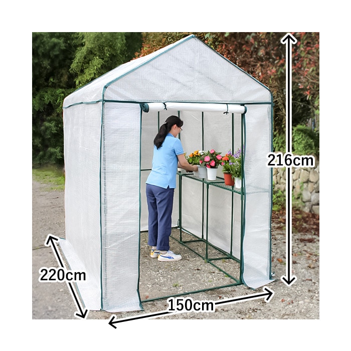 植物を霜や風から守るだけでなく自転車などの収納もできます。ハウス内の片側に棚があるので鉢植えなどを置くことができます。入り口は内側・外側の両側から開閉可能なファスナー式、奥には換気用のメッシュウインドー付き。ハウス転倒防止用に地面固定用ペグとひも付きアンカーピンが付いています。