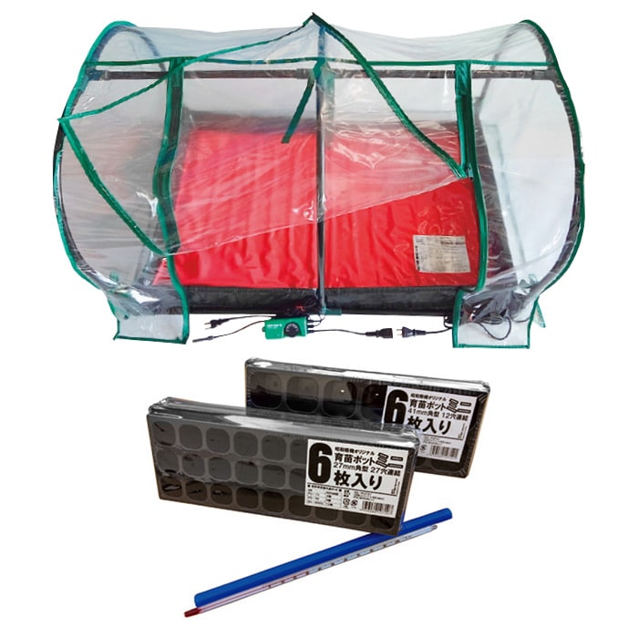 - らくらく園芸マット「ひなたぼっこ900E」1台、育苗ポットミニ 41mm角型12穴連結6枚1組、育苗ポットミニ 27mm角型27穴連結6枚1組、棒状温度計1本