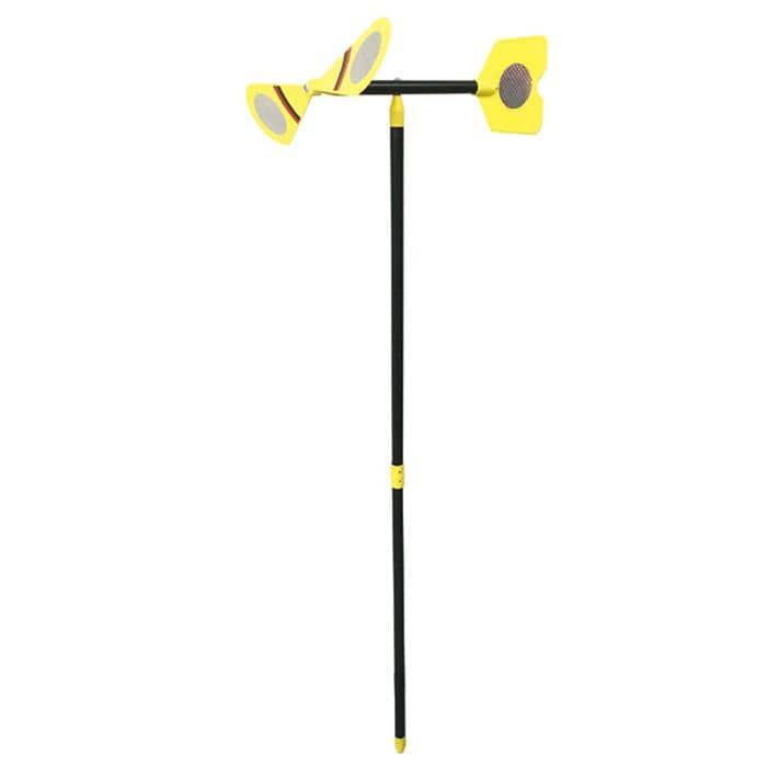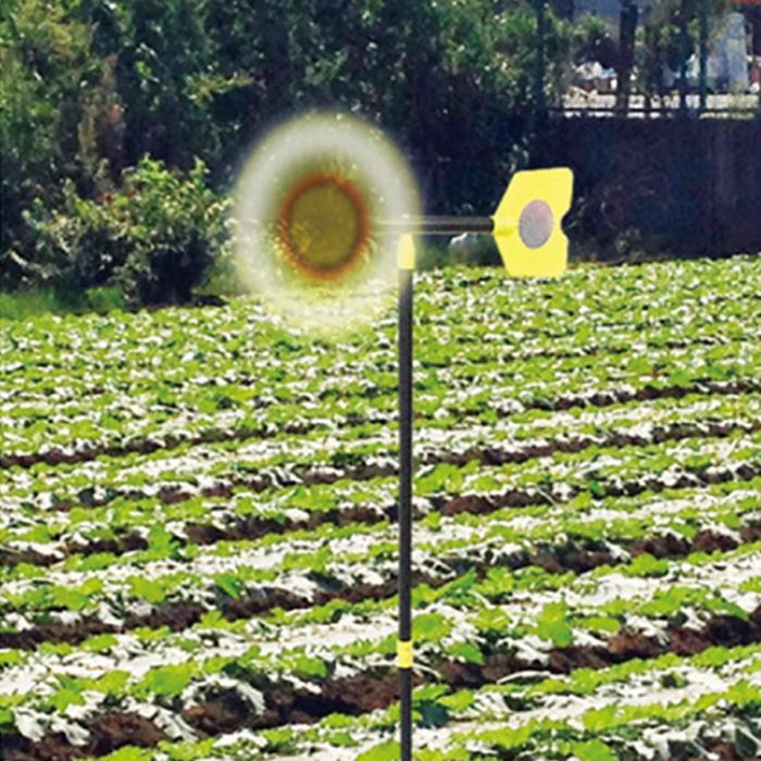 風の力で回転するプロペラが地面を振動させモグラよけとなり、プロペラのホログラムが光って鳥よけとなります。