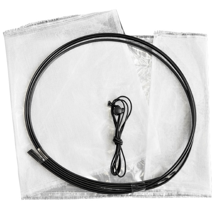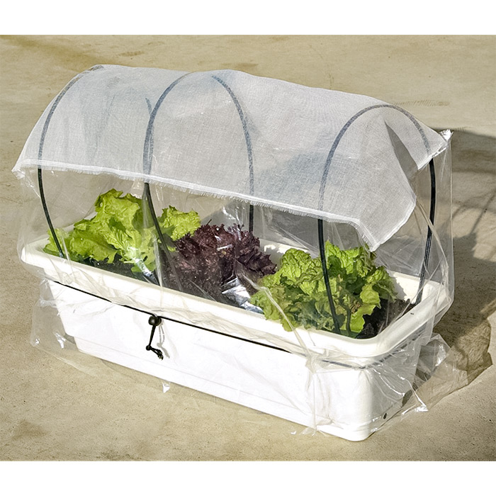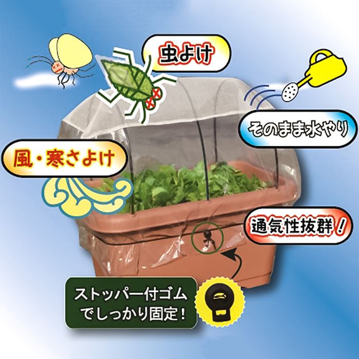 透明フィルムとメッシュが一体になった、プランター用のカバーセットです。メッシュ部で「防虫・通風・日よけ」、透明フィルム部で「保温・霜よけ・防寒」と、年間の栽培条件に応じて使い分けができるカバーです。使い方は、(1)支柱を差す (2)カバーを掛ける (3)固定ゴムで固定と、至って簡単。ベランダ菜園に欠かせない周年利用のプランター用被覆材です。夏場は、直射日光の当たらない半日陰での管理をおすすめいたします。