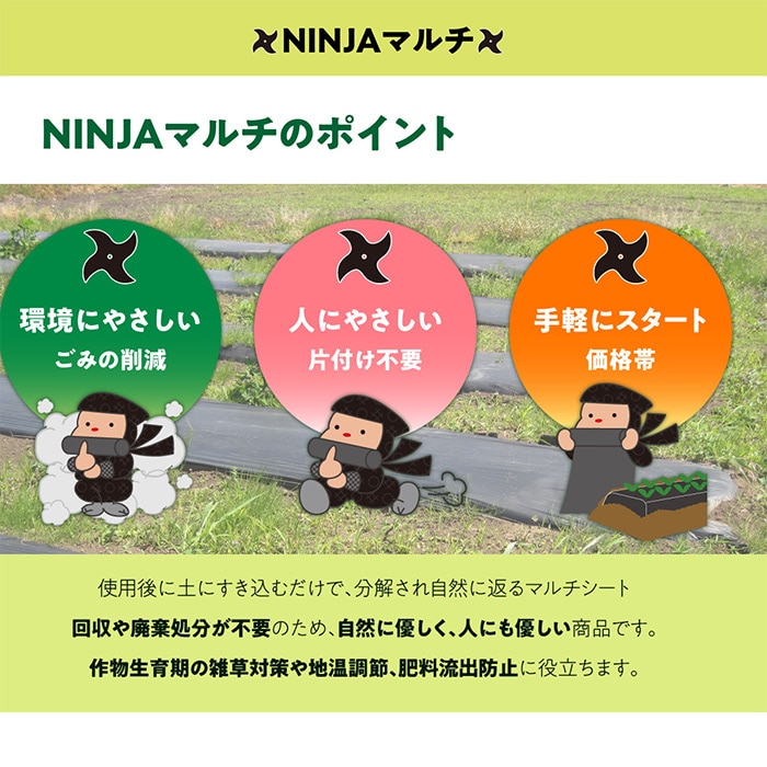 NINJAマルチのポイント 1.環境にやさしい(ごみの削減)2.人にやさしい(片付け不要)3.手軽にスタート(価格帯)