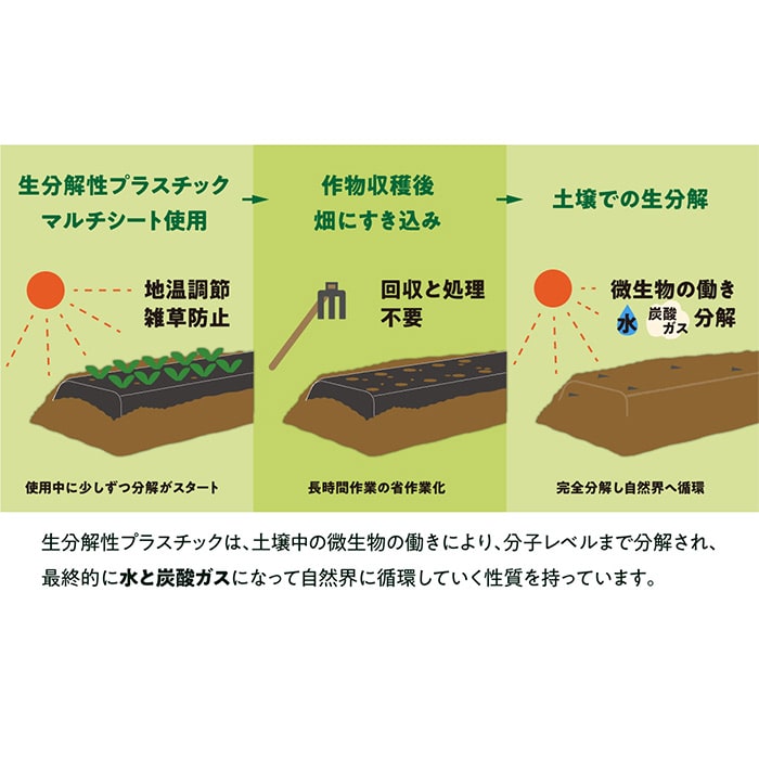 生物分解プラスチックは、土壌中の微生物の働きにより、分子レベルまで分解され、最終的に水と二酸化炭素になって自然に循環していく性質を持っています。