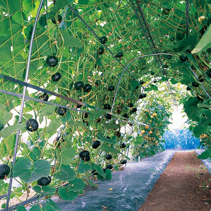 アーチパイプにつるものネットをかぶせれば、マメ類やゴーヤー、ミニカボチャ、キュウリなどのウリ類を、支柱を使って育てる空中栽培ができます。アーチの内側に実がなるため、見つけやすく、収穫時期を逃す心配もありません。