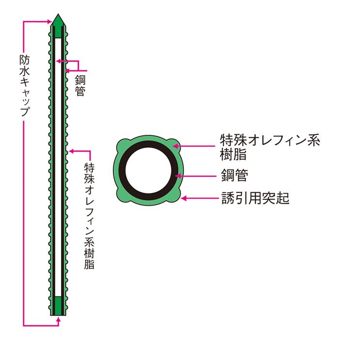 テープやクリップなどの誘引資材のずれを防止するイボ竹。また支柱を覆う樹脂膜や両端の防水キャップにより、さびに強く、肥料や農薬による劣化を防ぎます。