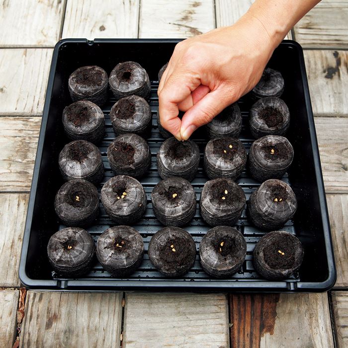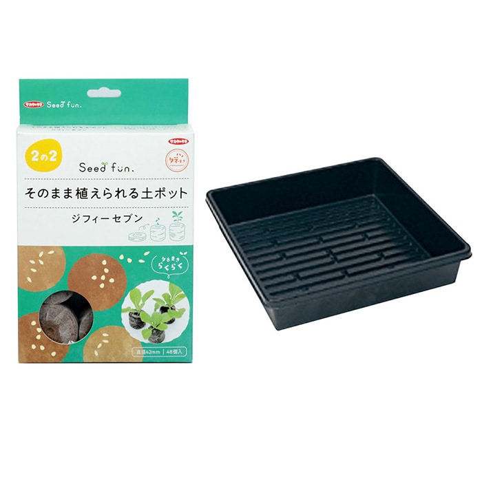 時間・場所を選ばずいつでもタネまきができる「ジフィーセブン」と、水やりや移動が楽になるトレーをセットにしました。