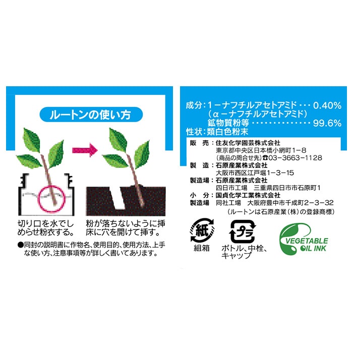挿し木、挿し苗の発根を促進させる植物成長調整剤です。発根が促進されることで、挿し木、挿し苗の活着がよくなります。